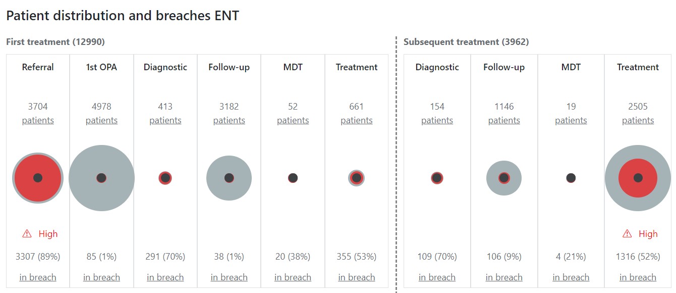 Patients who have waited longer than planned for an event to complete are highlighted as ‘breaches’ to users |